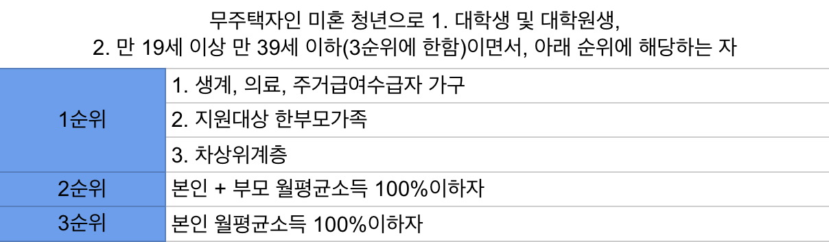 (우선공급) 긴급주거지원 : 사유발생시 지자체(주민센터)에 상시 신청 / 국가유공자 : 매년 초 국가보훈부에 신청 등