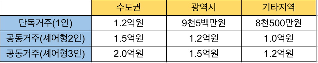 단, 전세금은 단독거주자는 호당 지원한도액의 150% 이내, 공동거주자는 호당 지원한도액의 200%이내로 제한