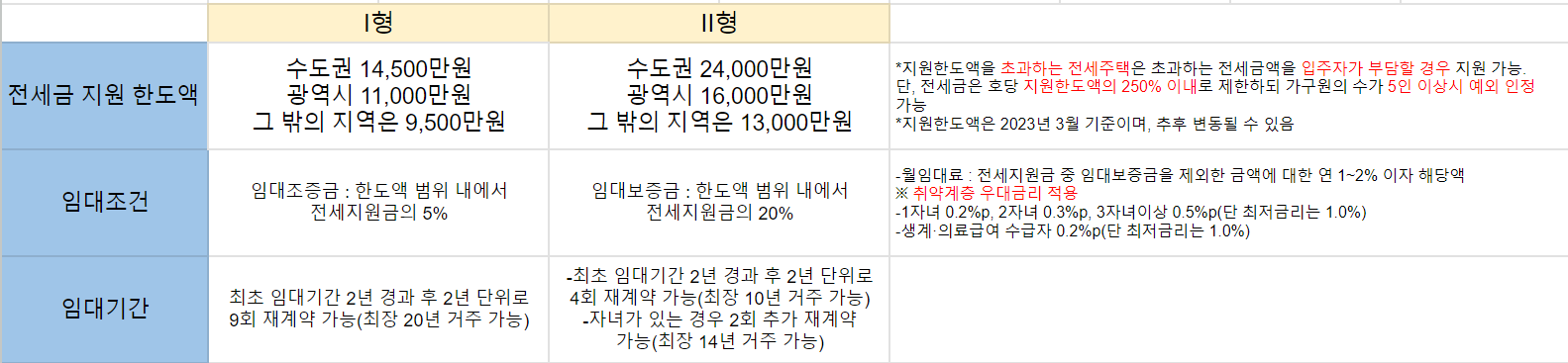 - I형과 II형의 차이점 (전세금 지원 한도액, 임대조건, 임대기간)